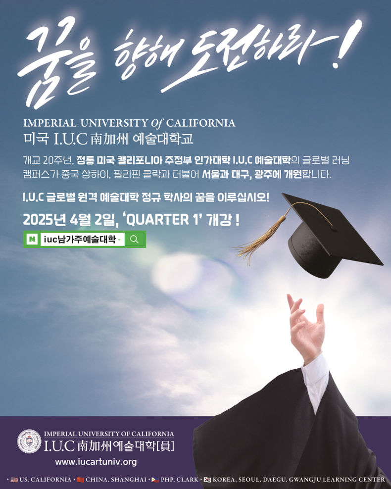 IUC남가주 예술대학은 설립 20년차로서 미국 캘리포니아 팜스프링스에 본교를 두고 원격 신학대학원, 예술대학원, 경영대학원을 운영하다 25년 4월부터 한국에 예술대학 전문 원격 러닝센터를 두고 서울과 대구에서 학부생을 모집 중이며 중국 상하이에서 뷰티산업학과 러닝 원격 캠퍼스를 중국어로 전문 개설한다.