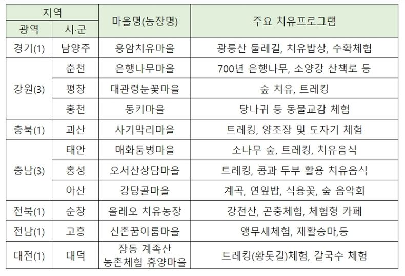 다양한 자원을 활용한 치유프로그램을 도입하여 시범적으로 운영하고 있는 마을로 마을 내 치유서비스 연계성, 이름 계절성, 프로그램 안전 및 안전성, 숙박 및 음식 서비스 등을 고려한 11개소를 소개합니다!