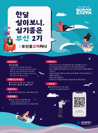 ‘한달 살아보니, 살기좋은 부산(2기)’ 참가자 모집은 오는 8월 1일부터 20일까지며, 참가서류 심사를 통해 20개 팀(예정)을 최종 선발한다. 이들은 오는 9월 1일부터 10월 31일까지 ‘부산관광 홍보대사’로 활동할 예정이다.