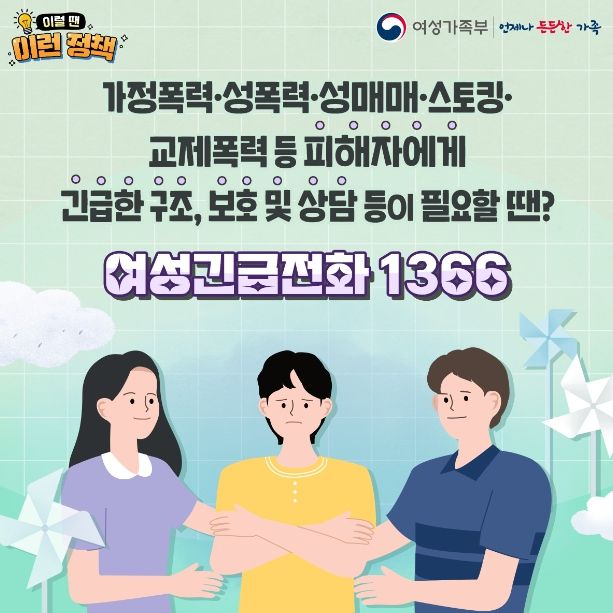 여성긴급전화 1366을 이용해 보세요! 피해자들이 언제든 피해 상담을 받을 수 있도록 「365일 24시간」 운영합니다.