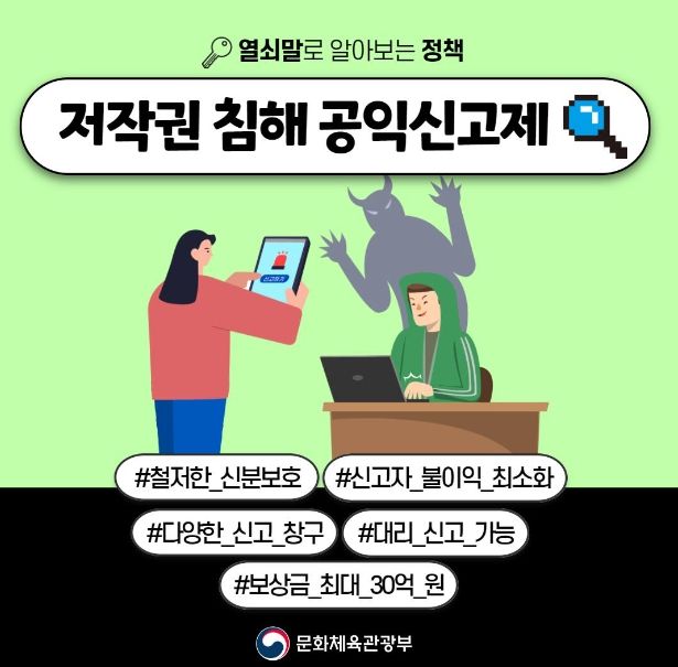 문화체육관광부는 저작권 침해 관련 공익신고를 활성화해 콘텐츠 불법 유통을 근절하고 국가전략산업인 콘텐츠산업의 성장 생태계를 보호하는 데 최선을 다하겠습니다.