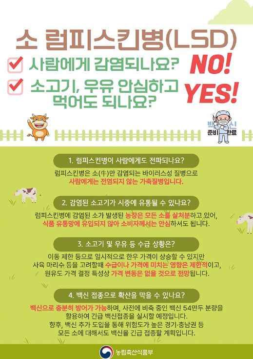 럼피스킨병에 감염된 소가 발생된 농장은 모든 소를 살처분하고 있어, 식품 유통망에 유입되지 않아 소비자께서는 안심하셔도 됩니다.