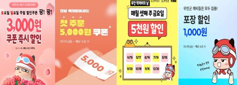 5월 한 달간 ▲주말 이벤트((매주 토요일, 일요일) 공공배달앱 먹깨비로 1만 5,000원 이상 주문 시 3천원 할인), ▲첫 주문 시 5천원 할인, ▲먹깨비의 날(매월 3째주 금요일) 5천원 할인, ▲포장 주문 1,000원 할인 등의 다양한 할인 이벤트가 예산 소진 시까지 진행될 예정이며, 무안군민 누구나 매일 1인 1회의 혜택을 받을 수 있다.