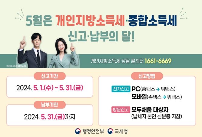 지난해 종합소득이 있는 납세자는 5월 말일까지 종합소득세와 개인지방소득세를 신고·납부 해야 한다. 국세와 지방세를 한 번에 신고·납부 할 수 있는 원스톱(ONE-STOP) 서비스 도입으로 홈택스·손택스 등에서 종합소득세 신고 후 바로 이동하여 한 번에 개인지방소득세까지 신고할 수 있다.