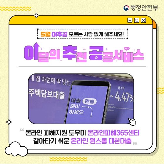 5월의 추천 공공서비스는 방송통신위원회의 ‘온라인피해365센터’와 금융위원회의 ‘온라인 원스톱 대환대출(이하 대출 갈아타기)’이 선정됐다.