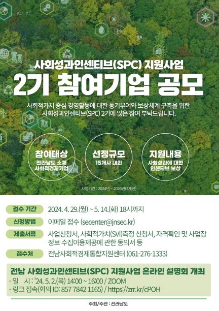 인사이드피플 기자 | 전라남도가 오는 14일까지 사회적경제기업이 창출한 사회성과를 인센티브로 보상해 기업 주도의 사회적경제 생태계 조성을 지원하기 위해 ‘전남 사회성과인센티브(SPC) 지원사업(2기)’ 참여 기업을 모집한다.