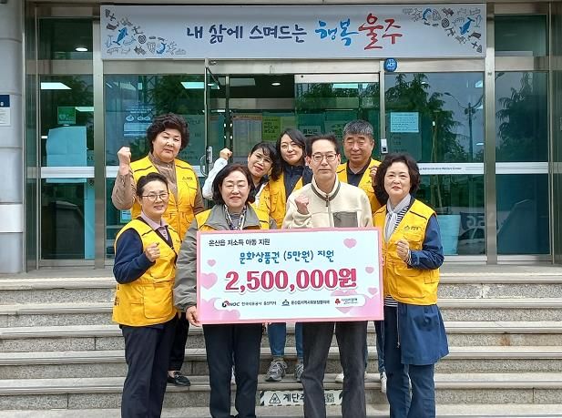 인사이드피플 기자 | 한국석유공사 울산지사가 2일 가정의 달을 맞아 울주군 온산읍 행정복지센터에서 지역 저소득 아동을 위한 문화상품권 250만원 상당을 전달했다.