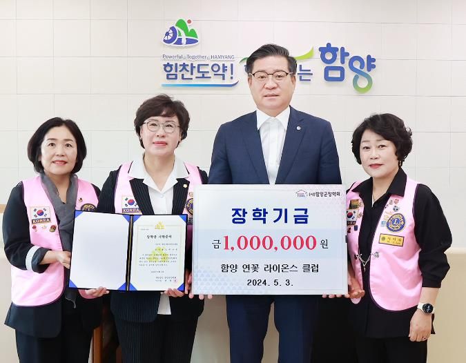 인사이드피플 기자 | 함양 연꽃라이온스클럽 배우진 회장을 비롯한 관계자 2명이 3일 오전 군수실을 방문해 함양군장학회에 장학금 100만 원을 기탁했다.