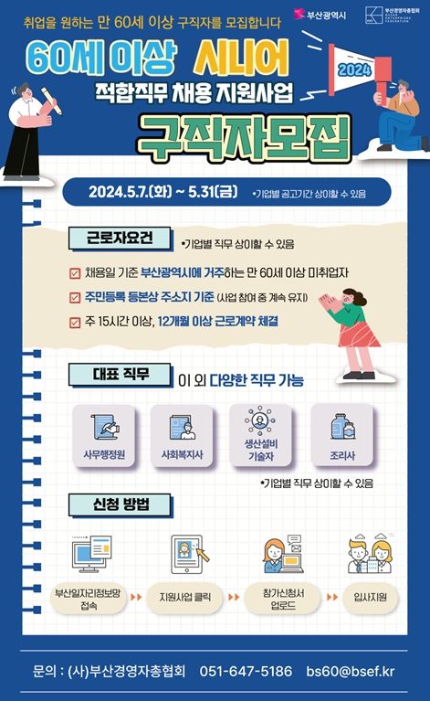 인사이드피플 기자 | 부산시는 오늘(7일)부터 '부산형 시니어 적합직무 채용 지원사업'의 참여자를 모집한다고 밝혔다.