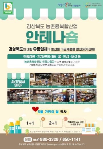 인사이드피플 기자 | 경상북도는 이달 31일까지 농업 6차(농촌 융복합)산업 안테나숍 7개소(대백프라자점, 이마트(경산점, 구미점, 월배점, 포항점), 신세계백화점 대구점, 롯데백화점 영등포점)에서 ‘2024년도 가정의 달 특판’행사를 개최한다.