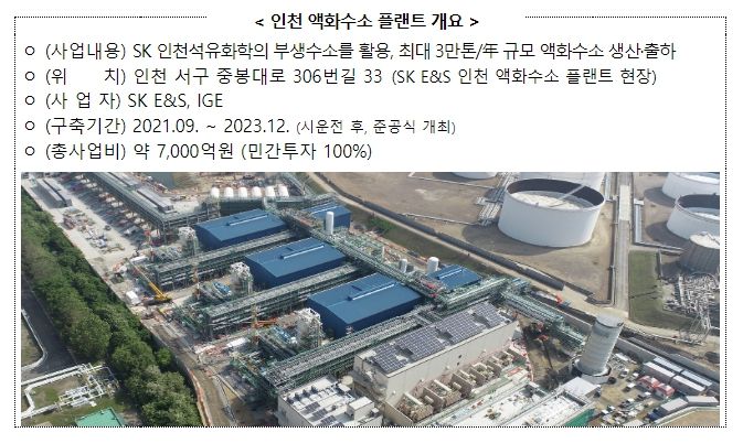 「인천 액화수소 플랜트」는 SK E&S가 총 7천억 원을 투자해 구축한 것으로, 최대 연 3만 톤의 액화수소를 생산할 계획이다. 이는 연간 약 5,000대의 수소버스가 충전할 수 있는 규모로, SK E&S는 동 플랜트와 연계해 금년중 약 20개소를 시작으로 '26년까지 총 40개소의 액화충전소를 전국에 구축하여 액화수소 유통망을 조성해 나갈 계획이다.