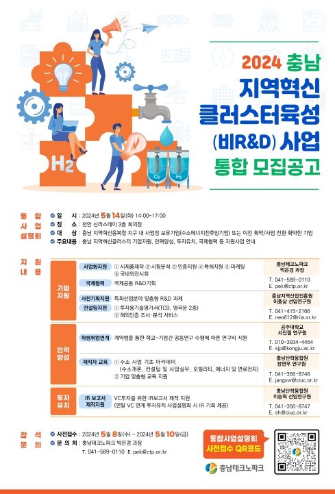 인사이드피플 기자 | (재)충남테크노파크는 2024년도 지역혁신클러스터 비R&D사업에 대해 충남 지역기업을 대상으로 ‘충남 지역혁신클러스터 통합사업 설명회’를 개최한다고 9일 밝혔다.