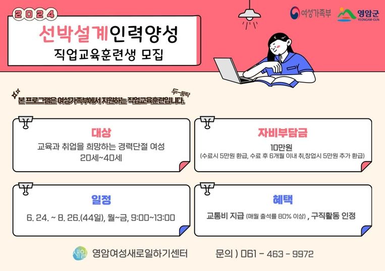 인사이드피플 기자 | 영암여성새로일하기센터가 6월 진행될 선박설계 인력양성 직업교육훈련 과정에 참여할 20~40세 취·창업 희망 경력단절여성을 모집한다.
