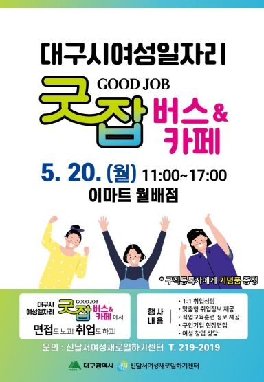 인사이드피플 기자 | 대구광역시는 취업을 희망하는 경력단절 및 미취업 여성을 위해 「찾아가는 취업상담 서비스 ‘굿잡(Good Job) 버스’'를 오는 5월 20일 오전 11시부터 이마트 월배점(진천역 4번 출구)에서 운영한다.