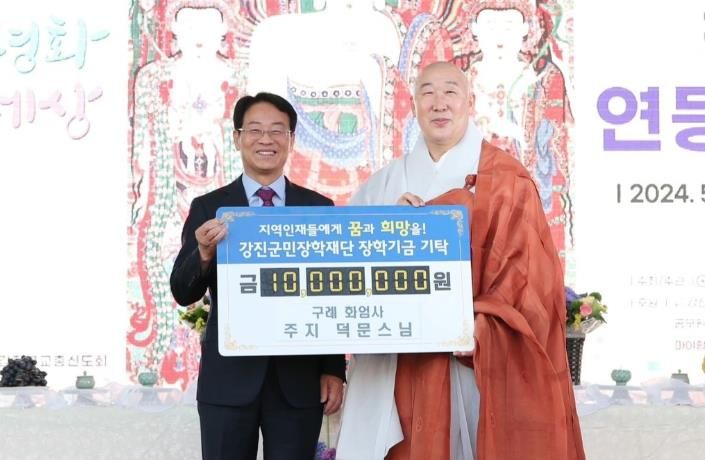 인사이드피플 기자 | 구례 지리산 화엄사 주지 덕문스님이 지난 10일 불기 2568년 부처님 오신 날 기념 군민 연등축제를 맞아 장학금 1,000만원을 강진군민장학재단에 기탁했다.