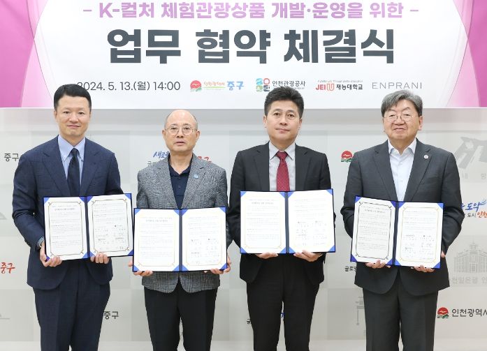 이를 위해 김정헌 구청장은 지난 13일 중구청 구청장실에서 백현 인천관광공사 사장, 이남식 재능대학교 총장, 김태훈 엔프라니화장품 대표이사와 ‘케이(K)-컬처 오색체험 관광상품 개발·운영을 위한 업무협약’을 체결했다.