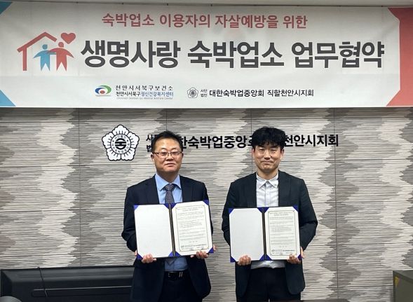 인사이드피플 기자 | 천안시 서북구보건소는 14일 (사)대한숙박업중앙회 직할천안시지회와 자살 위험 환경개선을 위한‘생명사랑 숙박업소’업무협약을 체결했다.