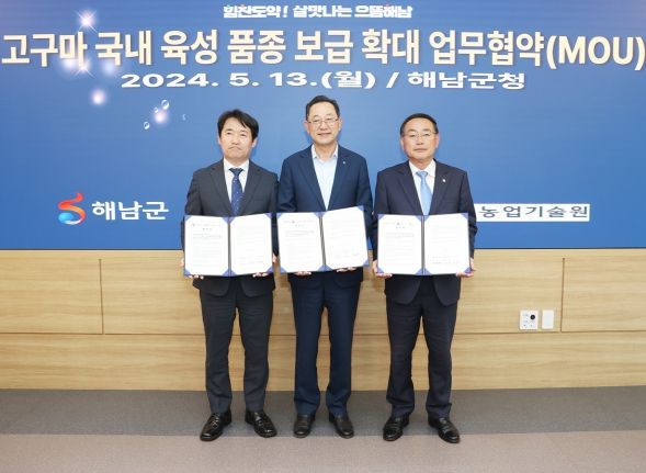 명현관 해남군수와 국립식량과학원 곽도연 원장, 전라남도농업기술원 박홍재 원장, 각 기관 관계자들이 참석한 가운데 열린 업무협약식에서는 해남고구마의 품질 경쟁력 향상을 위해 고구마 신품종의 품종 육성과 재배기술 개발 등에 유기적 협력체계를 구축해 나가기로 했다.