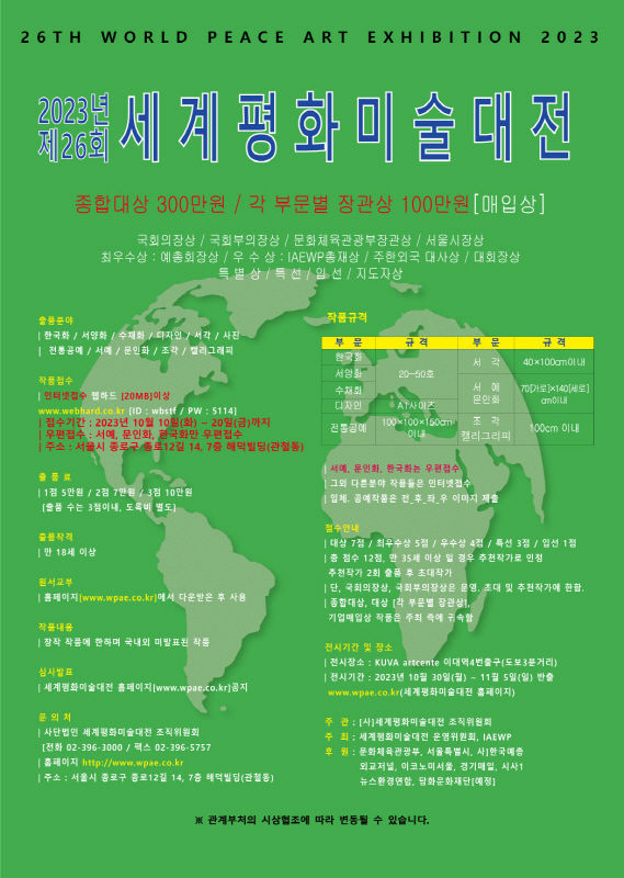 세계평화미술대전 조직위원회 담화 이존영이사장은 이번 제26회 세계평화미술대전이 오는 10월 10일~20까지 접수를 거쳐 10월 30일부터 11월 5일까지 7일간 KUVA artcente(이대역 4번 출구 핀란드빌딩) 지하 1층 아트센터에서 열린다고 밝혔다.