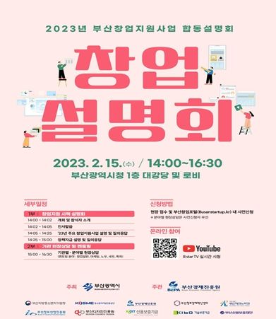 인사이드피플 박미영 기자 | 부산시는 오는 15일 오후 2시, 시청 1층 대강당에서 10개 창업지원기관과 함께 최초로 온·오프라인 동시 진행하는 '2023년도 부산 창업지원사업 합동설명회'를 개최한다고 밝혔다.