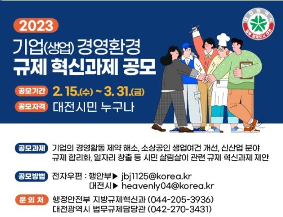 인사이드피플 박미영 기자 | 대전시는 행정안전부와 공동으로 오는 2월 15일부터 3월 31일까지(45일간) ‘2023년 기업(생업) 경영환경규제 혁신과제’를 공모한다고 밝혔다.
