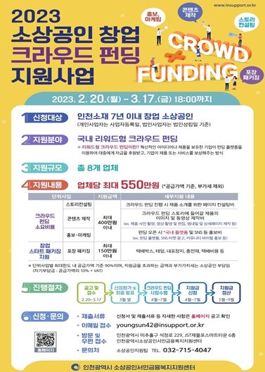 인사이드피플 박미영 기자 | 인천광역시는 초기 창업 소상공인에게 창업 아이템의 시장검증 기회를 제공하고, 온라인 판로개척을 지원하고자 ‘소상공인 창업 크라우드 펀딩 지원사업’에 참여할 업체를 오는 3월 17일까지 공개모집 한다고 밝혔다.