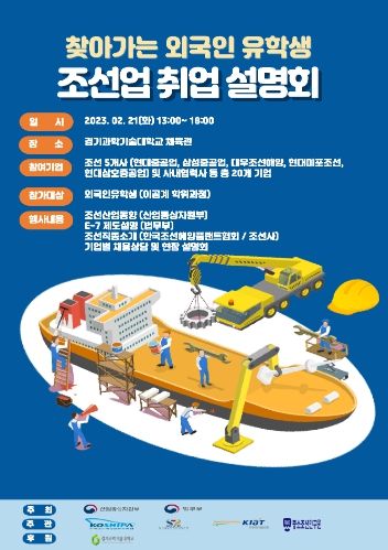 인사이드피플 박미영 기자 | 산업통상자원부와 법무부는 외국인 유학생의 조선업 취업과 기업의 구인을 지원하기 위해, 2월 21일 경기과학기술대학교에서 ‘찾아가는 외국인 유학생 조선업 취업설명회’를 개최했다.