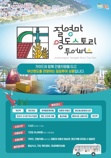 ‘절영마 영도 스토리 투어버스’는 25인승 버스에 투어 해설사가 탑승하여 주요 테마별 관광코스 소개 및 영도의 숨은 이야기를 감칠맛 나게 해설해 주는 일일 관광투어이다.