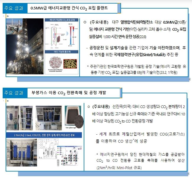 과기정통부는 그간 CCU 기술에 대한 기업참여를 촉진하고 전략적 투자를 뒷받침하기 위해 중장기 R&D 전략인 '이산화탄소 포집·활용 기술혁신 로드맵'을 마련(관계부처 합동, ’21.6)했으며, 연구개발 사업을 통해 CCU 원천기술을 확보했다.