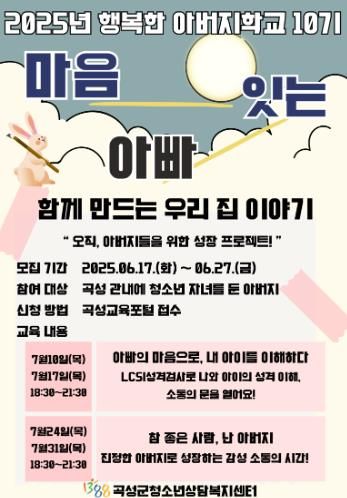 참여를 원하는 아버지는 오는 6월 28일까지 곡성교육포털을 통해 신청할 수 있으며 참가비는 무료이다.