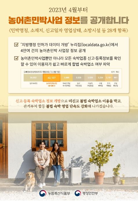 행정안전부와 농림축산식품부는 4월 17일부터 ‘지방행정 인허가 데이터개방’ 누리집에서 농어촌민박 4만 2천127개(‘23년 3월기준) 사업장의 명칭, 소재지, 영업상태, 소방시설 등을 포함한 28개 항목 정보를 확인할 수 있다고 밝혔다.