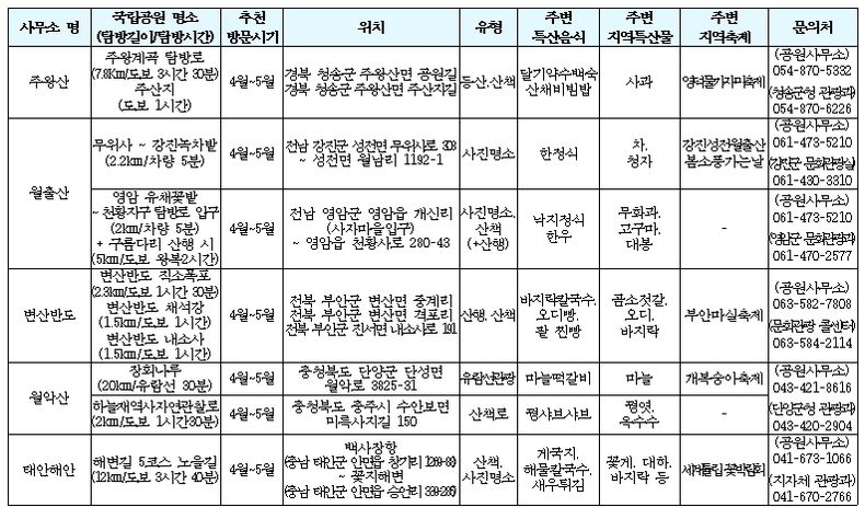 이번 국립공원 5곳에 대한 상세한 정보 및 문의처는 국립공원공단 누리집 공지사항에서 4월 17일부터 확인할 수 있다.