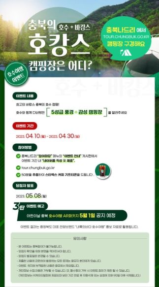 호수 이벤트 두 번째 주제는 ‘최고의 바캉스 충북의 호수 캠핑’이다. 호수 관광요소를 갖춘 자연친화적 숙박시설인 야영장을 감성숙소로 재발견하여 충북 호수로의 휴가문화 확산을 위한 이벤트로 참여방법과 경품은 호수 뷰티풀 이벤트와 동일하며 4월 30일까지 진행한다.