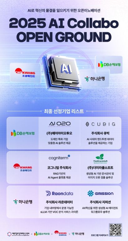 인사이드피플 심정보 기자 | 제주창조경제혁신센터(대표이사 이병선, 이하 제주센터)는 DB손해보험, 조광페인트, 하나은행과 함께 추진하는 특화산업 오픈이노베이션 ‘2025 AI 콜라보 오픈그라운드 프로그램’을 통해 최종 6개 스타트업을 선정하고, 기술 테스트와 솔루션 개발을 통해 실질적인 사업화 협력에 나선다.