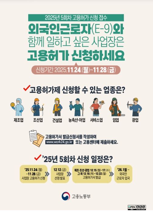 인사이드피플 심정보 기자 | 고용노동부는 11월 24일부터 11월 28일까지 전국 지방고용노동관서를 통해 외국인근로자(E-9)에 대한 올해 5회차 신규 고용허가 신청을 받는다.