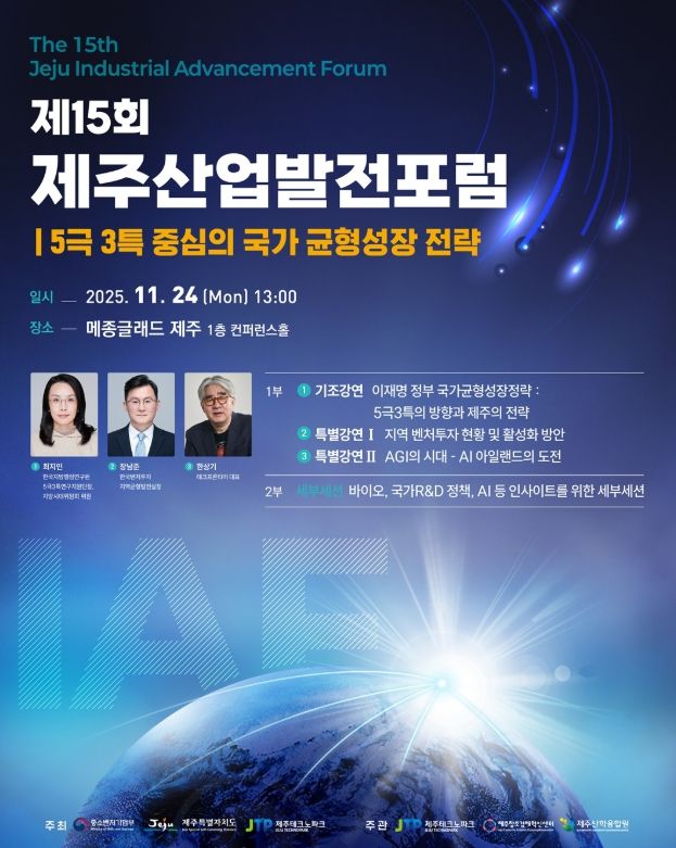 인사이드피플 심정보 기자 | 제주테크노파크(원장 지영흔, 제주TP)는 오는 24일 메종글래드 제주 1층 컨퍼런스홀에서 ‘5극 3특 중심의 국가 균형성장 전략’을 주제로 제15회 제주산업발전포럼을 개최한다.