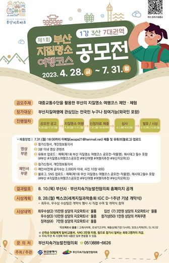 이근희 부산시 환경물정책실장은 “이번 공모전이 부산의 도시 인프라를 이용한 뛰어난 접근성과 자연경관·지질유산·탐방로 등을 두루 갖춘 도시형 지질공원의 매력을 널리 알릴 수 있는 계기가 될 것”이라고 전했다.