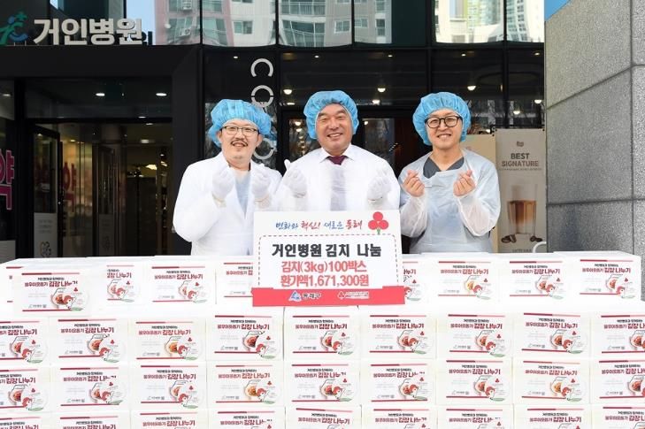 동래구 사직동에 위치한 거인병원은 매년 11월 말 김장김치 나눔 행사를 이어오고 있으며, 임직원들이 직접 배추를 선별부터 절임, 양념, 포장까지 담당하고 있다.