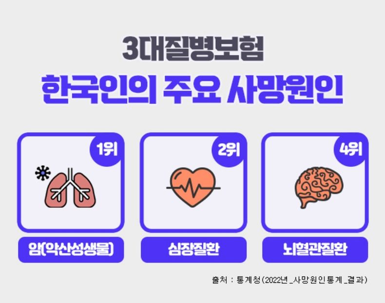 인사이드피플 조은설 기자 | 흔히 3대질병이라 일컫는 암, 심혈관질환, 뇌혈관질환은 통계청 발표자료에 따르면 한국인의 주요 사망원인 중에서 3위 폐렴을 제외하고 1~4위를 차지하고 있으며, 이전부터 지금까지도 살면서 가장 먼저 대비해야 하는 치명적인 질병으로 강조되고 있다. 이러한 중대질병에 대비하기 위하여 상기 세가지 치명적인 질병을 집중보장하는 3대질병진단비보험을 많이 가입하고 있다. 3대진단비보험은 각각의 질병을 중점적으로 보장하면서도 가입자 특성에 맞는 특약을 추가함으로써 종합건강보험으로도 활용할 수가 있다.