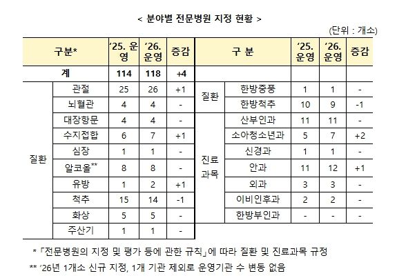 제5기 3차년도 전문병원 지정에 따라, 2025년 114개에서 2026년에는 118개 전문병원을 지정·운영하게 된다.