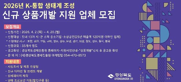 인사이드피플 심정보 기자 | 경상북도는 도내 유망 중소기업·소상공인의 제품 경쟁력 강화를 위해 ‘2026년 K-통합 마케팅 생태계 조성사업’의 일환으로 상품 기획부터 디자인·마케팅까지 전 과정을 지원하는‘신규 상품개발 지원사업’에 참여할 기업을 모집한다.