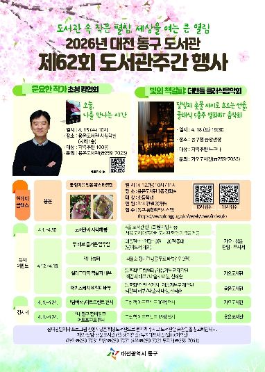 한편, 행사 내용 및 접수 등 자세한 사항은 대전 동구 공공도서관 누리집 공지사항을 통해 확인할 수 있다.