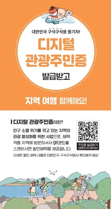 ‘디지털 관광주민증’이란 국내여행 전용 모바일앱 '대한민국 구석구석'에서 일종의 명예주민증인 디지털 관광주민증을 발급받고 QR코드를 활용해 해당지역 내 관광지 입장권을 포함해 숙박, 식음, 체험 등 각종 여행 편의시설과 체험프로그램 할인 혜택을 받을 수 있는 제도이다.