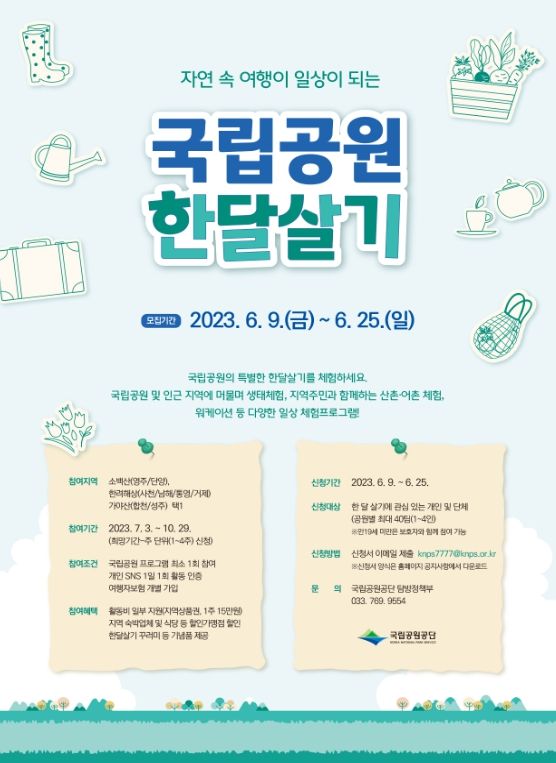 인사이드피플 강애자 기자 | 환경부 산하 국립공원공단(이사장 송형근)은 지역 체류형 여행에 관심 있는 탐방객을 대상으로 '국립공원 한 달 살기' 참여자를 6월 9일부터 25일까지 모집한다.