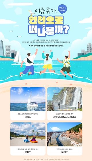 ‘인천의 여름 휴가지 중 가장 떠나고 싶은 장소는’ 이라는 주제로 진행되는 이번 온라인 이벤트는 인천의 여러 관광지 중 2022년 하계 휴가철 인천투어 홈페이지에서 많은 검색량을 차지한 4곳 중 한 곳을 선택하는 것이다.