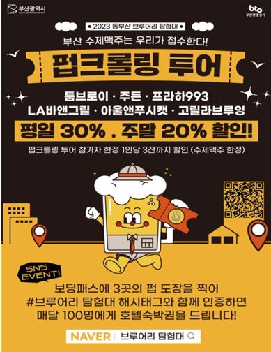 ▲동부산 펍 크롤링 투어는 술집을 뜻하는 ‘펍(Pub)’과 기어 다니다라는 뜻의 ‘크롤(Crawl)’의 합성어로, 하룻밤에 대여섯 군데의 펍을 돌며 맥주를 즐기는 형식의 투어다. 네이버 스마트 플레이스에서 990원에 크롤링 티켓을 구매하면 동부산에 위치한 주요 펍(툼브로이, 주든, LA바앤그릴, 아울앤푸시캣, 프라하993, 고릴라브루잉) 중 세 군데에서 최소 20%, 최대 30%까지 할인된 가격으로 수제맥주를 즐길 수 있다. 상시로 운영되는 이번 투어 외 월 1회 툼브로이 양조장 투어도 사전 신청을 통해 진행될 예정이다.