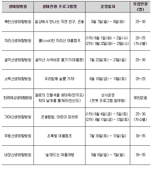 인사이드피플 강애자 기자 | 환경부 산하 국립공원공단(이사장 송형근)은 7월 21일부터 8월 20일까지 4주간 여름방학을 맞이하는 아이들과 함께 온 가족이 즐길 수 있는 국립공원 여름 캠프 참가자를 7월 1일부터 모집한다.
