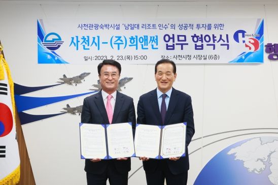 인사이드피플 김성연 기자 | 사천시는 23일 시청 시장실에서 호텔사업을 하고 있는 주식회사 희앤썬과 남일대 리조트의 성공적 투자를 위한 업무협약을 체결했다.