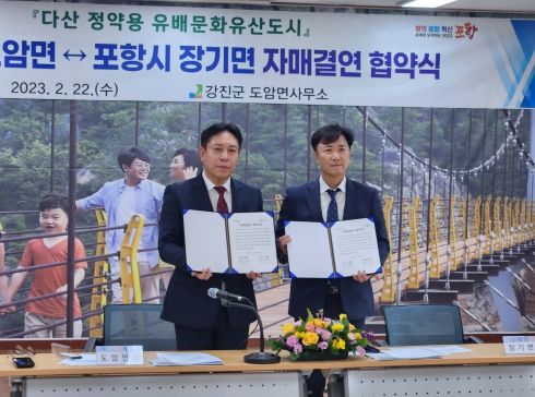 인사이드피플 김성연 기자 | 지난 22일, 전남 강진군 도암면과 경북 포항시 장기면이 도암면사무소에서 자매결연 협약식을 가졌다.
