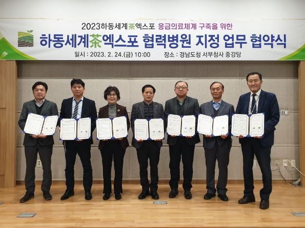 인사이드피플 김성연 기자 | 하동세계차엑스포조직위원회는 2월 24일 경상국립대학교병원, 진주고려병원, (진주)제일병원, (진주)한일병원, 사천하나병원, 하동중앙의원과 2023하동세계차엑스포(5.4.~6.3.) 응급의료체계 구축을 위해 업무협약을 체결했다.